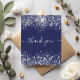 A navy blue background color. Decorated with faux silver glitter dust. On front large white hand lettered script and the text: Thank You.