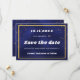 A Save the Date for a 50th (or any age) birthday party. A navy blue colored background. Decorated with a golden frame and confetti. For both him and her.