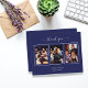 Add 3 of Your birthday photos, vertical size, a date, name, and the thank you note. A classic navy blue background with white text and frame. The text: Thank you on the front and your name on the back are written with a stylish hand lettered script with swashes.