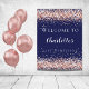 A welcome board for a girly and glamorous 21st (or any age) birthday party. A navy blue background decorated with rose gold faux glitter, sparkles. Personalize and add a name and age 21. White letters.