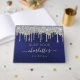 A guestbook for a feminine and glamorous 21st (or any age) birthday party. A stylish navy blue background with faux silver glitter drips, paint dripping look. The blue color is uneven. Add your name and age 21. The name is written in white with a modern hand lettered style script with swashes. Personalize and add your text on the spine.