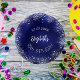 A paper plate for a girly and glamorous 18th (or any age) birthday party. A chic navy blue background with faux silver glitter, sparkles. The blue color is uneven. The text: The name is written with a large modern hand lettered style script. Personalize and add a date, name and age.