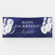 For a girly and glamorous 21st (or any age) birthday party. A navy blue background. The blue color is uneven. Decorated with white balloons. Personalize and add a name and age 21. White letters. The name is written with a modern hand lettered style script with swashes.