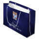 A gift bag for a 50th (or any age) birthday. A classic navy blue background, the blue color is uneven. Personalize and add a photo, date, name and year 50. The name is written in white with a modern hand lettered style script.