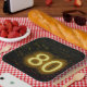 Illuminated marquee neon sign on a dark brick wall for 80th birthday.