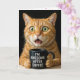 A surprised orange ginger cat is holding a black coffee mug with a funny message.