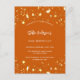 A burnt orange background decorated with golden stars. Personalize and add a name and party details. The name is written with a hand lettered style script, white colored letters.