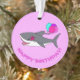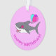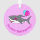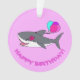 Ornament with cute shark with pink flower holding party balloons in pink, purple and turquoise colors. The text says "Happy Birthday!" The design is customizable and you can personalize the text.
