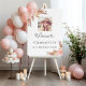 A welcome board for an elegant and modern birthday party. White background, decorated with boho style pampas grass and rose gold and blush pink florals. Personalize and add a photo, name and age.