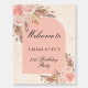 A welcome board for an elegant and modern birthday party. Golden marble and a rose gold arch decorated with boho style pampas grass, rose gold and blush pink florals. Personalize and add your name and age.