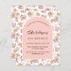 An arch frame on a pattern of pampas grass and pink flowers and a golden cross. Personalize and add a name and details.