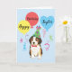 Happy birthday greetings with this cute design featuring a smiling, party hat-wearing Beagle puppy surrounded by colorful balloons and streamers. Name can be easily changed; just click on personalize button.