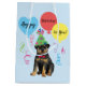 Happy birthday greetings with this cute design featuring a happy, party hat-wearing Rottweiler puppy surrounded by colorful balloons and streamers. “Happy Birthday, [name]” on front and “Happy Birthday to You!” on back. Name can be easily changed; just click on personalize button.
