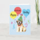 Happy birthday greetings with this cute design featuring a smiling, party hat-wearing Soft Coated Wheaten Terrier puppy surrounded by colorful balloons and streamers. Name can be easily changed; just click on personalize button.