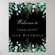 A welcome poster for an elegant and modern birthday paraty. A black background. Decorated with eucalyptus greenery, woodland ferns. Personalize and add a name, age/event.