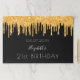 A black background with faux gold glitter drip, paint dripping look. Personalize and add a date, name and age 21. The name is written with a modern hand letteres style script.