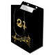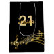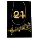 Chic black background with faux gold music notes for a 21st birthday. Templates for the age 21 and name. The name is written in a hand-lettered style script. Golden letters and number.
