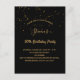 On front: A trendy, modern 50th (or any age) birthday party invitation card for men. A classic black background. With golden confetti, golden colored letters. Personalize and add a name and your party information.