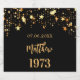 A black background decorated with faux gold stars. The text: The name is written in dark rose gold with a large modern hand lettered style script. Personalize and add a date, name and year of birth. For both him and her.