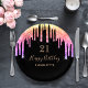 Girly and trendy for a 21st (or any age) birthday party. A chic black background decorated with rainbow colored faux glitter drips in purple, pink and rose gold. Templates for a date and name/age 21. Golden letters. The text: Happy Birthday is written in a modern hand lettered style script.