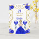 This birthday card invitation features an elegant gold frame, a beautiful princess with blonde hair and a royal blue dress, flowers and a balloon.