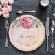 A napkin for a girly and glamorous 50th (or any ge) birthday party. Blush pink and rose gold gradient background. A large pink watercolored rose, green leaves, foliage with small golden flowers. A faux drips, paint dripping ribbon behind the flowers. Personalize and add a name, age 50 and a date. The name is written in dark rose gold with a modern hand lettered style script. 50th birthday is written with curved text.