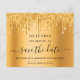 A faux gold metallic foil looking background decorated with faux gold glitter drips. On front: Personalize and add a date and name/text. Black colored letters. The text: Save the Date is written with a large trendy hand lettered style script.