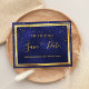 A Save the Date card for a 50th (or any age) birthday party for a guy, man, male. A dark blue background decorated with golden confetti and a faux gold and black frame. The blue color is uneven. Templates for a date and name/age 50. Golden colored letters. The text: Save the Date is written with a large trendy hand lettered style script.