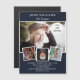 Create your own unique photo collage. Use four, 4 of your favorite photos. Personalize and add a name and party details. Dark blue background, white text.