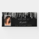 A banner for a girly and glamorous 21st (or any age) birthday party. A chic black background with trendy faux silver glitter drips, paint dripping look. Personalize and add your own vertical photo of the birthday girl. With the text: Welcome to. Add a name and age or text. The name is written in a modern hand lettered style script. White letters.