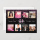 A photo collage thank you card for girls and women. Personalize and add 8 of your 21st (or any age) birthday party photos on the front. Add your name, age, date. A stylish black background with pink and purple confetti.