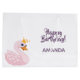 A sweet pink princess swan on a white background. Pink frames. With the text: Happy Birthday! Template for a name. Purple letters.