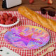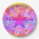 Birthday party plates with yellow, orange, pink, purple, and other colors, stars and bubbles, your child's name and the words Happy Birthday! Coordinating cups and napkins sold separately. Designed by HAMbyWhiteGlove. aka HAMbyWG.