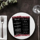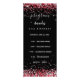 Birthday party program and menu card. Personalize and add a name, age, date and the menu. A black background. Decorated with red confetti, white text.
