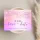 A girly and trendy Save the Date card for a 21st (or any age) birthday party. A rainbow and unicorn colored background in purple, pink, rose gold. Decorated with faux glitter in purple and pink. Personalize and add a date and name/age 21. Purple colored letters. The text: Save the Date is written with a large trendy hand lettered style script with swashes.