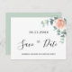 A modern Save the Date card for a 50th (or any age) birthday party. On the front: A chic white background decorated eith green watercolored eucalyptus greenery and a rose gold colored rose, flower floral. Personalize and add a date and name/age 50. Black colored letters. The text: Save the Date is written with a large trendy hand lettered style script.