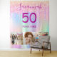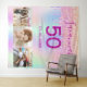 For a 50th (or any age) birthday party. A collage of 3 of your photos of herself friends, family, interest or pets. A rainbow, holographic background color in purple, pink, rose gold and mint green. Decorated with faux glitter drips. Personalize and add her name, age 21 and a date. Date of birth or the date of the birthday party. Purple colored text. Perfect for a surprise party! Use as a welcome banner, wall decoration or as a photo booth backdrop.