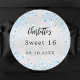A faux silver looking background. Decorated with blue faux glitter, sparkles. Personalize and add a name and date. The name is written with a hand lettered style script