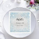 A faux silver looking background. Decorated with blue faux glitter, sparkles. Personalize and add a name and date. The name is written with a hand lettered style script