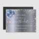 A girly and trendy Save the Date magnet card for a 50th (or any age) birthday party. A trerndy dark faux silver metallic looking background decorated with faux silver glitter dust and blue flowers. Personalize and add a date and name/age. The text: Save the Date is written with a large trendy hand lettered style script.