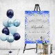A faux silver background, decorated with royal blue confetti. With the text: Welcome to - 21st birthday party. Personalize and add your name.