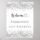A welcome poster for a girly and glamorous 21st (or any age) birthday party. A white background decorated with faux silver confetti. Personalize and add a name and age 21. Welcome with a heart.