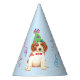 Happy birthday greetings with this design featuring a cute, party hat-wearing Welsh Springer Spaniel puppy surrounded by colorful streamers.