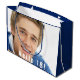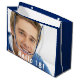 Personalize and add Your own photo. White text overlay: Hello 18! A gift bag for a 18th (or any age) birthday party for him. Navy bluye bacground color.