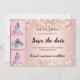 A Save the Date card for a 50th (or any age) birthday party. Rose gold gradient background. Decorated with confetti. The text: Save the Date is written with a large trendy hand lettered style script. Personalize and add a 3 photos.