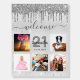 A welcome board for a 21st (or any age) birthday party, celebrating her life with a collage of 5 of your photos. Personalize and add a name, age 21 and a date. Date of birth or the date of the party. Gray colored letters. Elegant faux silver metallic looking background, decorated with faux glitter drips, paint dripping look. With the text: Welcome
