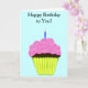 Happy Birthday to You is written in black typography against light turquoise blue background. Pink frosted chocolate cupcake in yellow green wrapper. Blue white flicker candle. Leave card verse, or personalize with your own. Colorful round and heart balloon images. Original Artwork and Design © TamiraZDesigns.