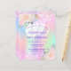 A girly and feminine 18th (or any age) birthday party invitation. On front: A rainbow, holographic colored background in purple, pink, mint green, rose gold. Decorated with blush pink faux glitter, sparkles and white balloons. Personalize and add a name and party details. The name is written with a hand lettered style script, purple colored letters.