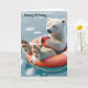 A polar bear floating on an orange life preserver in the arctic water and sipping a drink from a red party cup for a birthday.