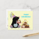 cartoon mole holding a piece of birthday cake. Happy birthday.Children illustration